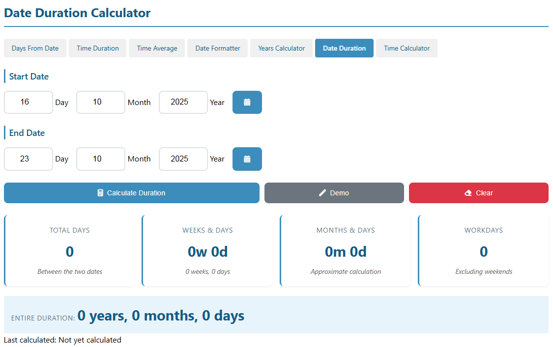 Our date duration calculator helps you figure out exactly how many days are between two dates. Whether you're planning an event, tracking a project, or just curious, this tool makes it easy to calculate the time between any two dates.