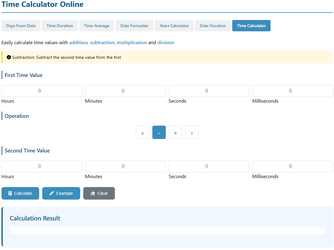 Here's the best part: you don't need to be a math whiz to use our calculator. Just enter the time values you have and choose what you want to do with them. Our tool does all the heavy lifting for you, handling the tricky conversions automatically. It's like having a time expert in your pocket, ready to help whenever you need it.