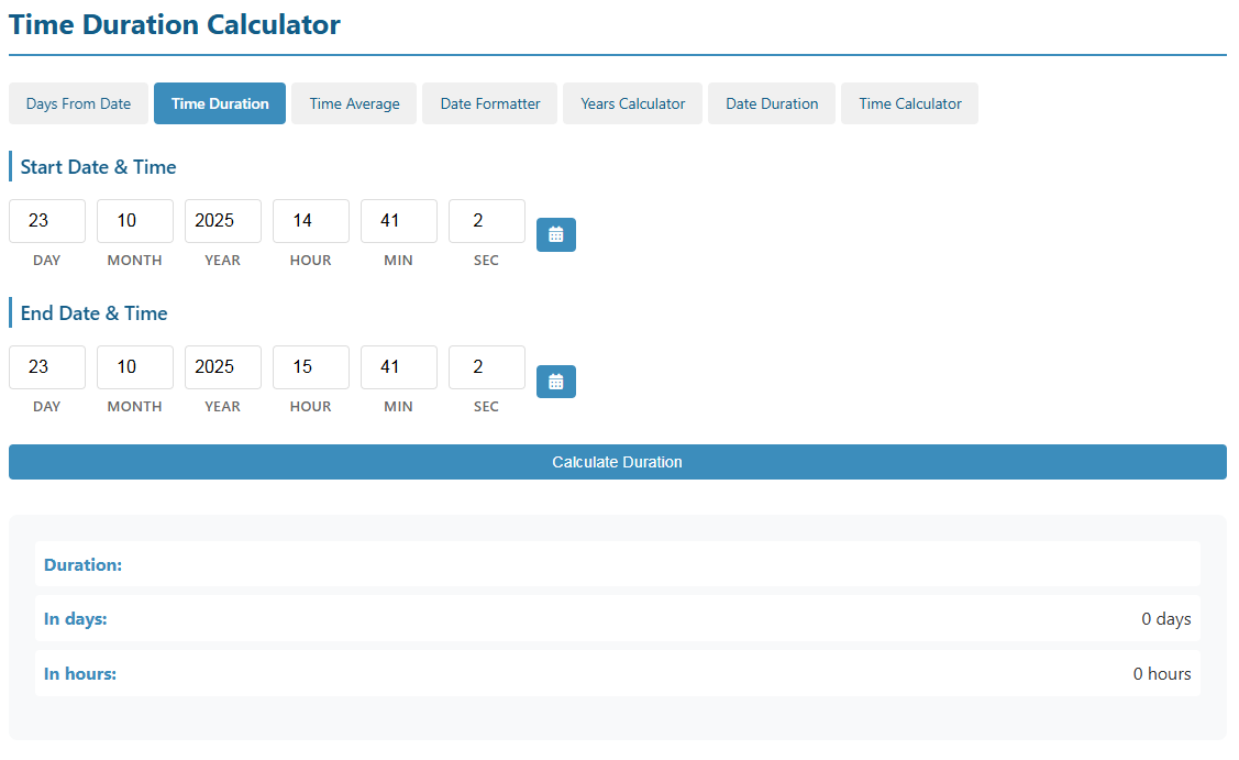 - Calculate Duration Button - Clicking it . The tool calculates the time difference between the input start and end times.