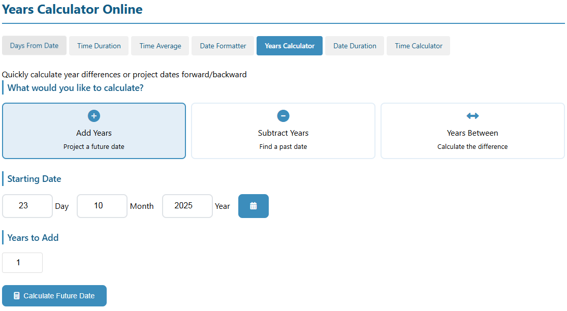 Need to work with dates but hate the math? Our free calculator does the year calculations for you - no calendar counting required!